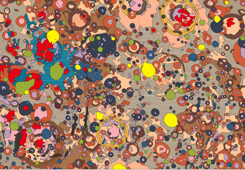 After examining the image for a while, and knowing that it is a map of mineral deposits on the moon. I begin to see a pattern where the circular shapes represent craters. Thinking this way you begin to see two layers of shapes. The lower layer seems to give me the impression of the regular landscape of the moon. Comprised of shapes that are not circular, the shapes on this layer relate more to topographical shapes. The upper layer is mostly circluar shapes.Then there are a few dashed lines that run across the image.